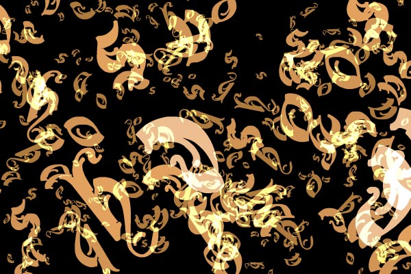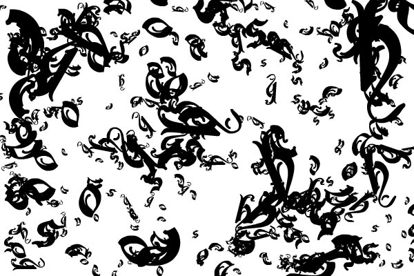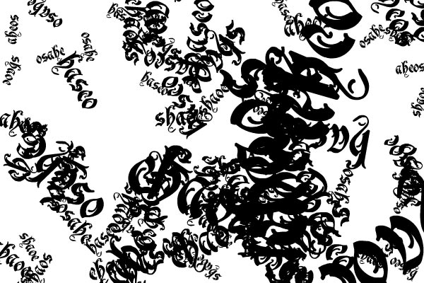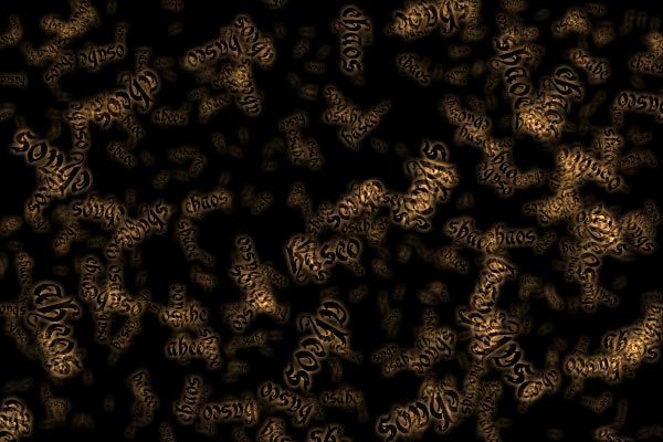 This example was adapted from Jared Tarbell's "Chaos" example in "New Masters Of Flash Vol 3". I chose to generate words or random characters from those words instead of Jared's shapes. This example was then hacked together with a dynamic blur and colour filtering script to generate textural patterns that gradually fade out. You can see it working in this Flash example.